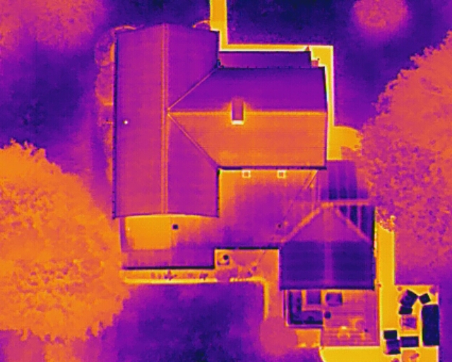 • Thermal Imaging: Our high level infra-red sensor payload detects heat sources in hard-to-reach areas. As you can see below: HVAC equipment, attic heat vents and roof rafters through the shingles.
